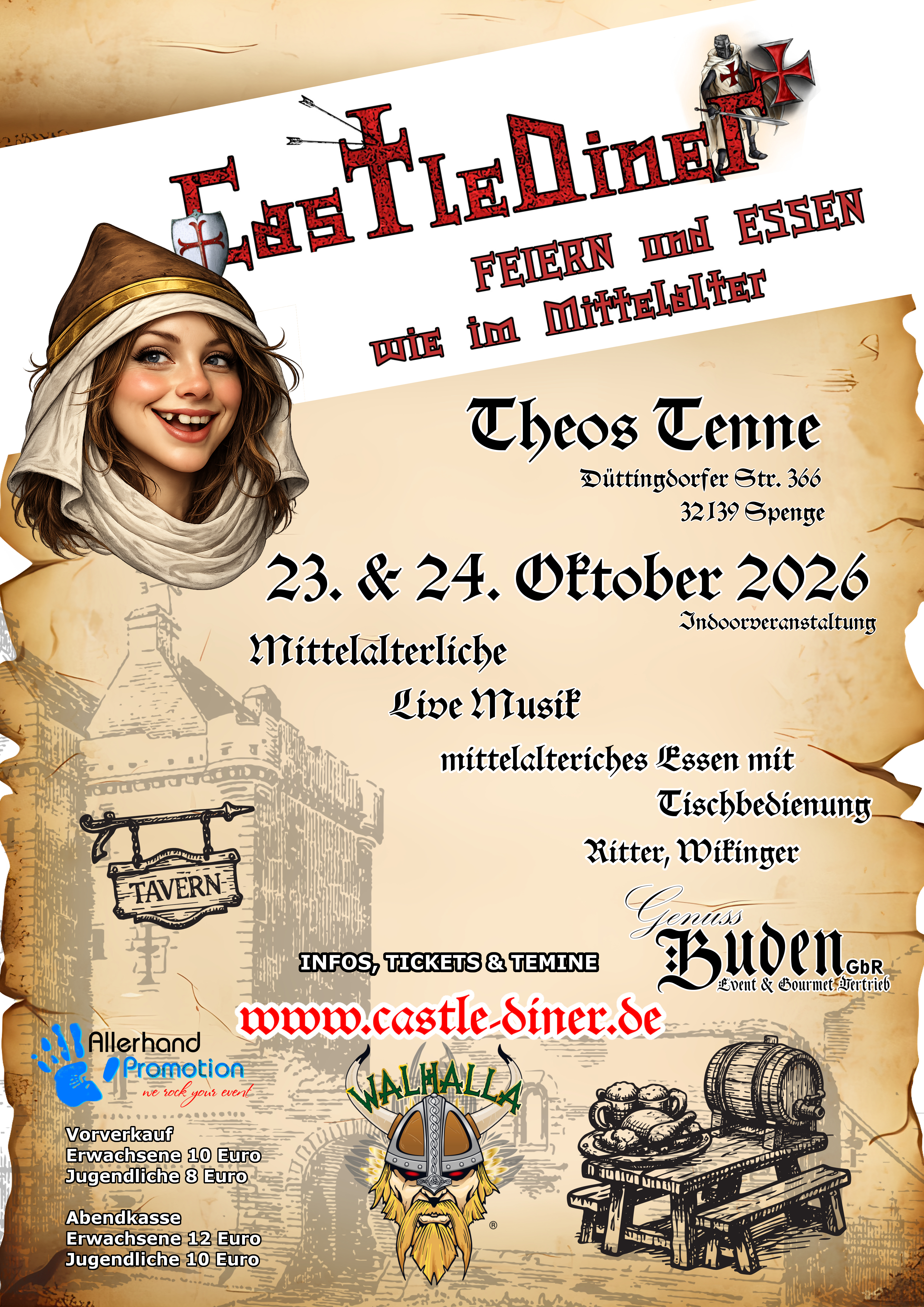 Im Castle Diner ist die Vergangenheit lebendig. Hier können Sie sich zurücklehnen, genießen und in die Welt des Mittelalters eintauchen. Von köstlichen Buffets bis zu fesselnder Unterhaltung – jede Minute dieses außergewöhnlichen Festes ist darauf ausgelegt, Ihnen ein Stück Geschichte näherzubringen. Seien Sie Teil dieser besonderen Reise und erleben Sie das Mittelalter hautnah – es wird ein Fest, das Sie nie vergessen werden!